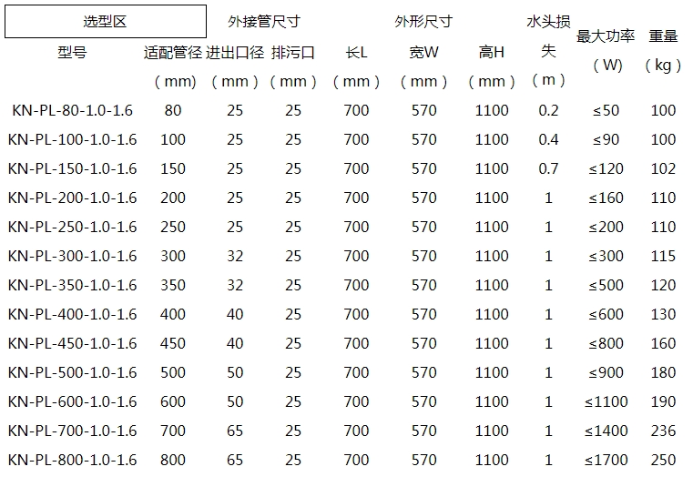 ❀设备选型及参数-开式旁流水处理器选型参照表
