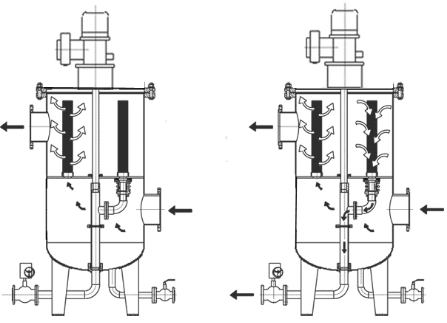 全自动反冲洗过滤器用于去除低粘度介质中的固体颗粒。需过滤的介质从内向外流过过滤器的楔形网滤芯,固体颗粒截留在滤芯内侧。随着污染物的增多,过滤器污染侧和清洁侧之间的压差增大。若压差达到设置的触发压差便开始自动反冲洗。反冲洗时.电动机通过减速器转动欲清洗滤芯下面的冲洗臂,进入反冲洗状态的滤芯,原料液流被中断。反冲洗排污阀门(电磁阀/气动阀)开启,滤液侧和反冲洗管路之间的压降把一小部分滤液逆向冲入欲清洗的滤芯。聚积在滤筒内侧的污染颗粒物被松开并通过冲洗臂冲进反冲洗管路。滤芯的反冲洗时间一过,反冲洗阀立即关闭。这样所有滤芯被依次清洗,所有滤芯都被清洗后,反冲洗循环周期结束。